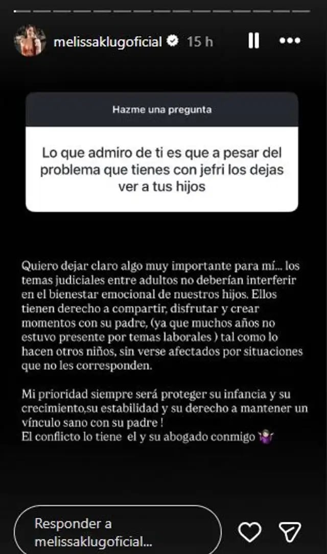 La empresaria aprovechó sus historias para explicar su posición, subrayando que su prioridad no son los conflictos entre adultos, sino el bienestar emocional de sus hijos. Según su enfoque, las diferencias personales no deben repercutir en la vida de los menores ni afectar su relación con su padre.