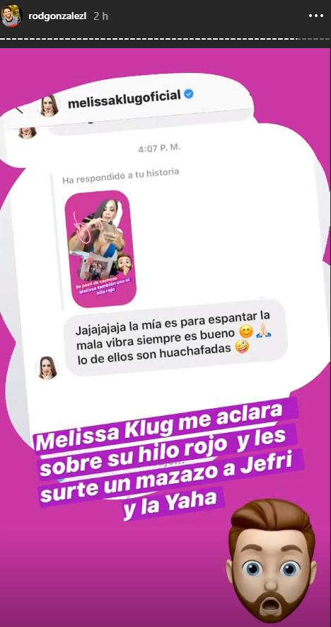 Sin embargo, la popular ‘Blanca de Chucuito’ no se quedó callada y decidió aclarar el uso de su hilo rojo por mensaje interno. “Melissa Klug me aclara sobre su hilo rojo y les surte un mazazo a Jefri y la Yaha”, comentó con ironía el exconductor de televisión al publicar los mensajes de la ‘chalaca’.
