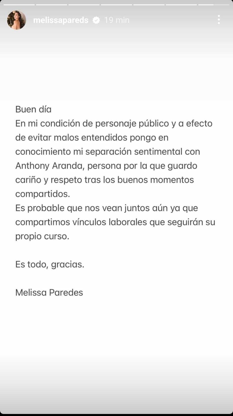 A través de sus redes sociales, Melissa Paredes acaba de anunciar el fin de su relación con el bailarín Anthony Aranda. La conductora de TV afirma que le guarda mucho cariño por todos los momentos que pasaron juntos.