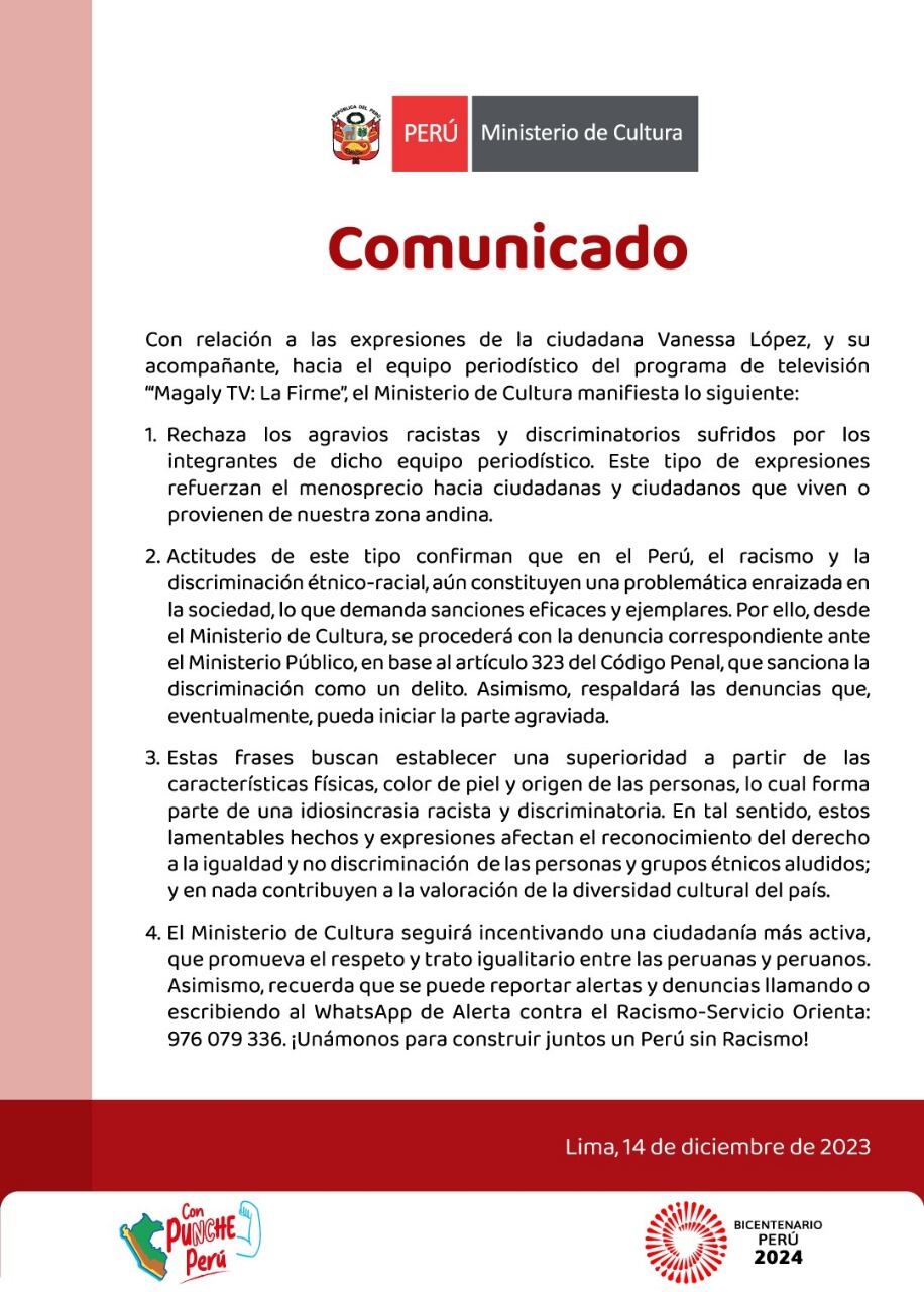 El Ministerio de Cultura se pronunció tras los comentarios racistas y discriminatorios que emitió Vanessa López contra el equipo periodístico del programa ‘Magaly TV: La Firme’.