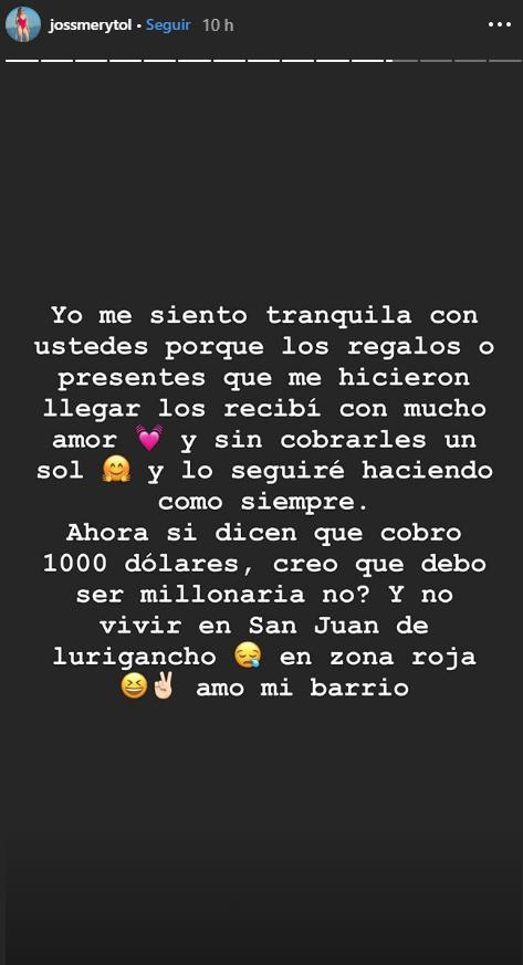 “Si dicen que cobro 1000 dólares, creo que debo ser millonaria no? Y no vivir en San Juan de Lurigancho, en zona roja, amo mi barrio”, manifestó Toledo a través de un comunicado en sus historias de Instagram.