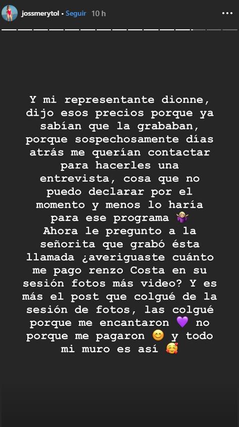 Ante las críticas que recibió por parte de la conductora de televisión, Jossmery Toledo utilizó sus redes sociales para negar que cobre dichas tarifas y responderle a Magaly Medina.