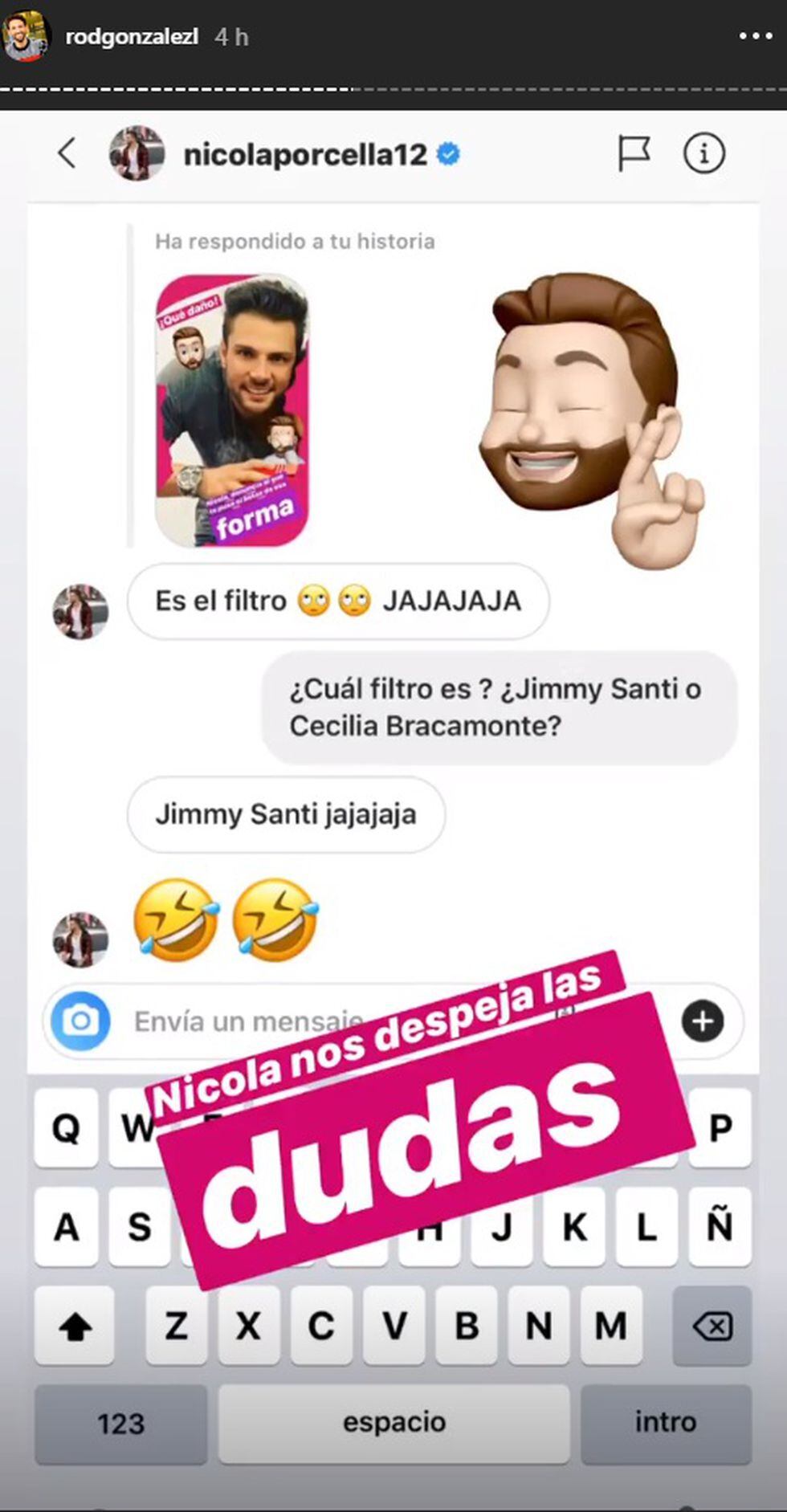 “¿Cuál filtro es? ¿Jimmy Santi o Cecilia Bracamonte?”, volvió a bromearle Rodrigo González, a lo que Nicola Porcella respondió entre risas: “Jimmy Santi jajajaja”.