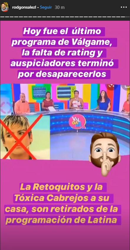 “Hoy fue el último programa de Válgame. La falta de rating y auspiciadores terminó por desaparecerlos. La ‘Retoquitos’ y la ‘Tóxica’ Cabrejos a su casa, son retirados de la programación de Latina”, escribió en exconductor de televisión en su cuenta de Instagram.