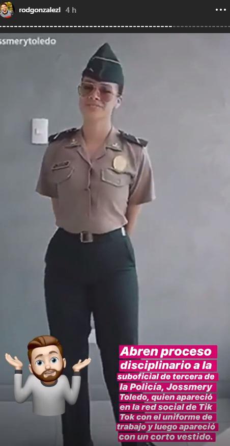 “Abren proceso disciplinario a la suboficial de tercera de la Policía, Jossmery Toledo, quien apareció en la red social de Tik Tok con el uniforme de trabajo y luego apareció con un corto vestido”, escribió el exconductor de ‘Válgame’.