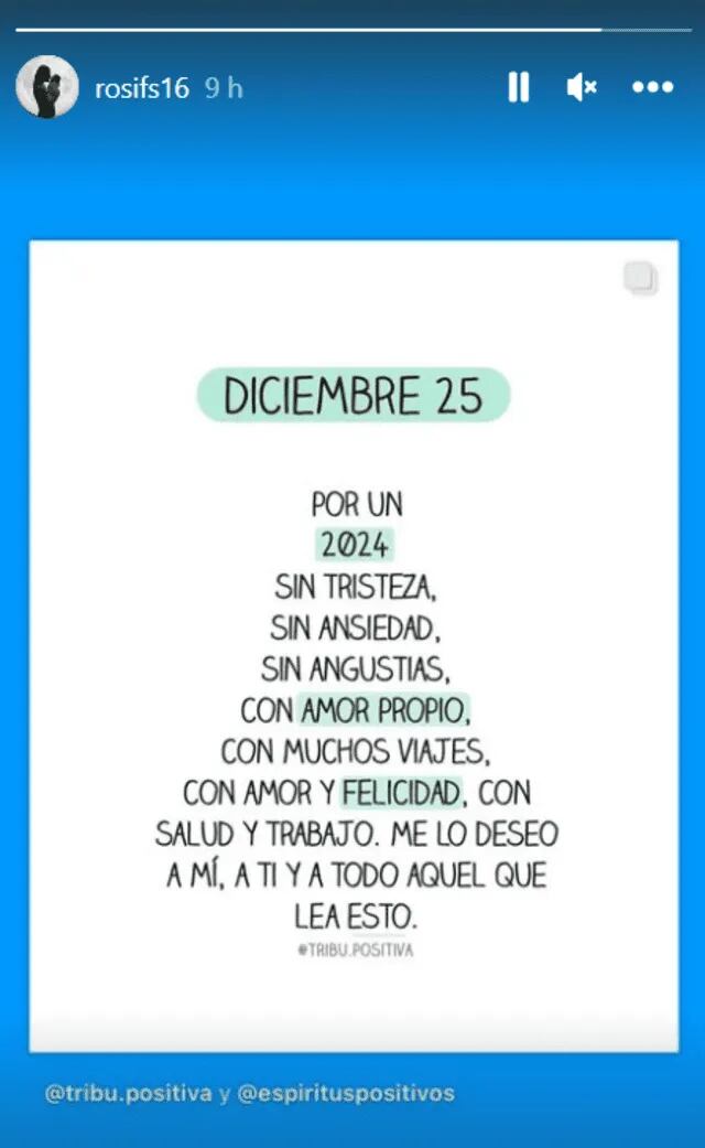 “Por un 2024, sin tristeza, sin ansiedad, sin angustias, con amor propio, con muchos viajes, con amor y felicidad, con salud y trabajo. Me lo deseo a mí, a ti y a todo aquel que lea esto”, se lee en su publicación.