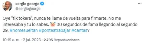 El reconocido productor sorprendió al enviar un contundente mensaje, pero sin mencionar a la también influencer, pese a ser un claro mensaje para ella: “Oye ‘tiktokera’, nunca te llame de vuelta para firmarte. No me interesaba y tu lo sabes. 30 segundos de fama llegando al segundo 29″, escribió.
