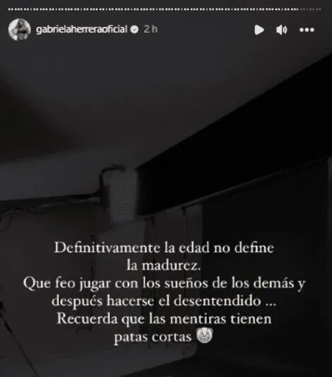 Por otro lado, Gabriela Herrera publicó un texto que sería su respuesta a Sergio George: “Definitivamente la edad no define la madurez. Que feo jugar con los sueños de los demás y después hacerse el desentendido. Recuerda que las mentiras tienen patas cortas”, sentenció.