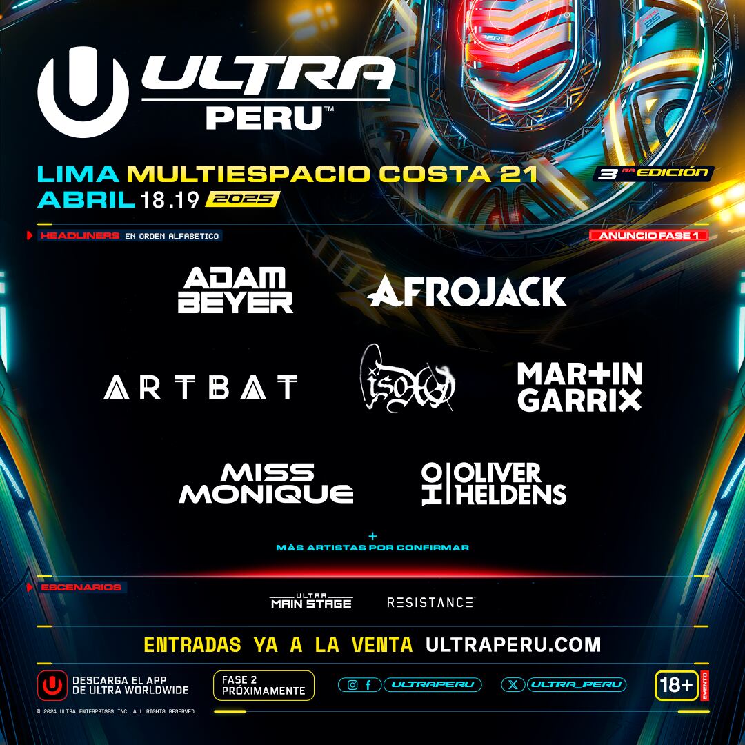 La Fase 1 del Lineup de ULTRA Perú 2025 presenta a grandes nombres como el superestrella global Martin Garrix, el pionero holandés Oliver Heldens, el dúo ucraniano de techno melódico ARTBAT, el jefe del sello Drumcode Adam Beyer, el fenómeno internacional holandés Afrojack, el genio del hard trap ISOxo y la artista viral de techno ucraniano Miss Monique.