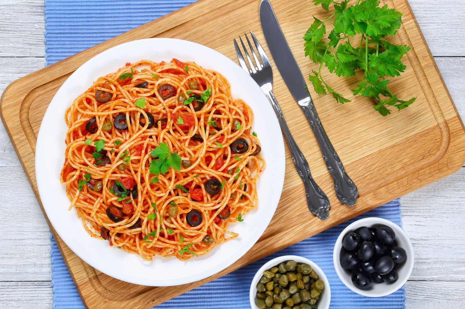 En otra hornilla, poner en una sartén 50 g de mantequilla con un chorro de aceite. Retirar del fuego y añadir 150 g de aceitunas licuadas y cuatro tomates pelados y picados gruesos. En la misma sartén sofreír tres dientes de ajo picados con un chorrito de aceite junto con el contenido de dos sobres de doña gusta sabor gallina y el resto de ingredientes. Llevar al fuego nuevamente y cocinar por un minuto para obtener la salsa. Mezclar con los espaguetis escurridos. Servir bien caliente, con queso parmesano rallado.