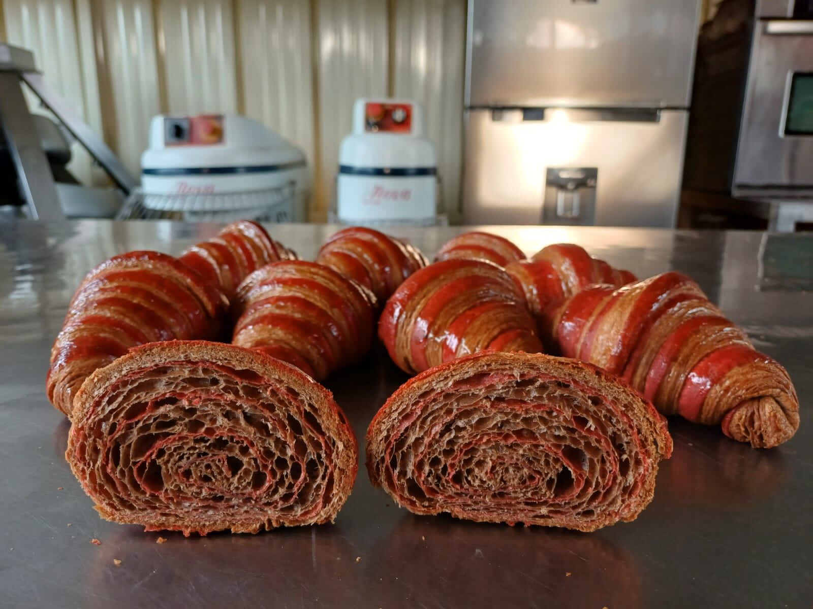 - Refrigeración adicional por 30 minutos para que la masa se relaje, seguido de un doblez simple. Refrigeración a 4 °C durante una hora. Retiro de la masa roja refrigerada, laminado y montaje sobre el pastón de la masa hojaldre en forma rectangular (100 x 25 cm aprox.). Corte en piezas triangulares de 10 cm de ancho x 25 de largo. Fermentación por 2 a 3 horas. Barnizado con huevo y hornear a 150 °C durante 25 minutos.