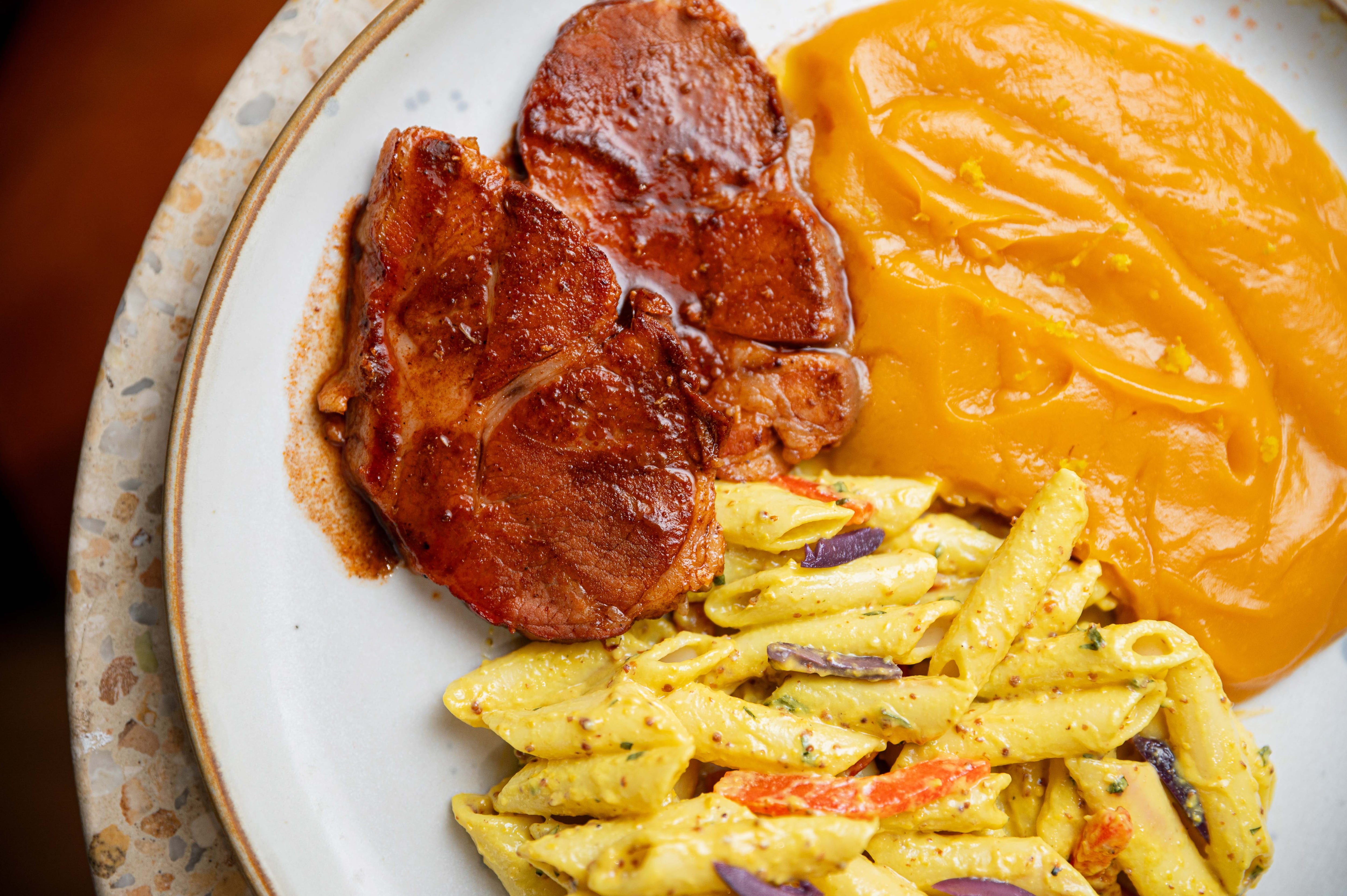 El almuerzo incluye una proteína al horno, a elegir entre pavo o panceta, acompañada de dos guarniciones, que pueden ser: