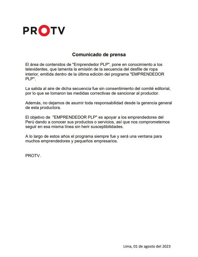 Asimismo, Pro TV se había expresado previamente sus disculpas por haber transmitido la secuencia del desfile de niños en ropa interior. Aseguraron que esto ocurrió sin la autorización del comité editorial, lo que implicó una violación de los procedimientos establecidos.