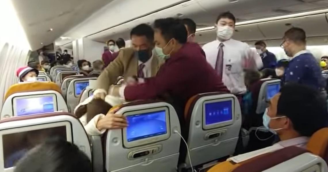 El avión había llegado desde Bangkok, pero detuvieron a los tripulantes por siete horas, para realizar una evaluación a los pasajeros por el coronavirus. Un asistente de vuelo varón se dirigió a la mujer para advertirle la revisión, pero ella no accedió a la revisión, por lo que el hombre violentamente le hizo una llave.