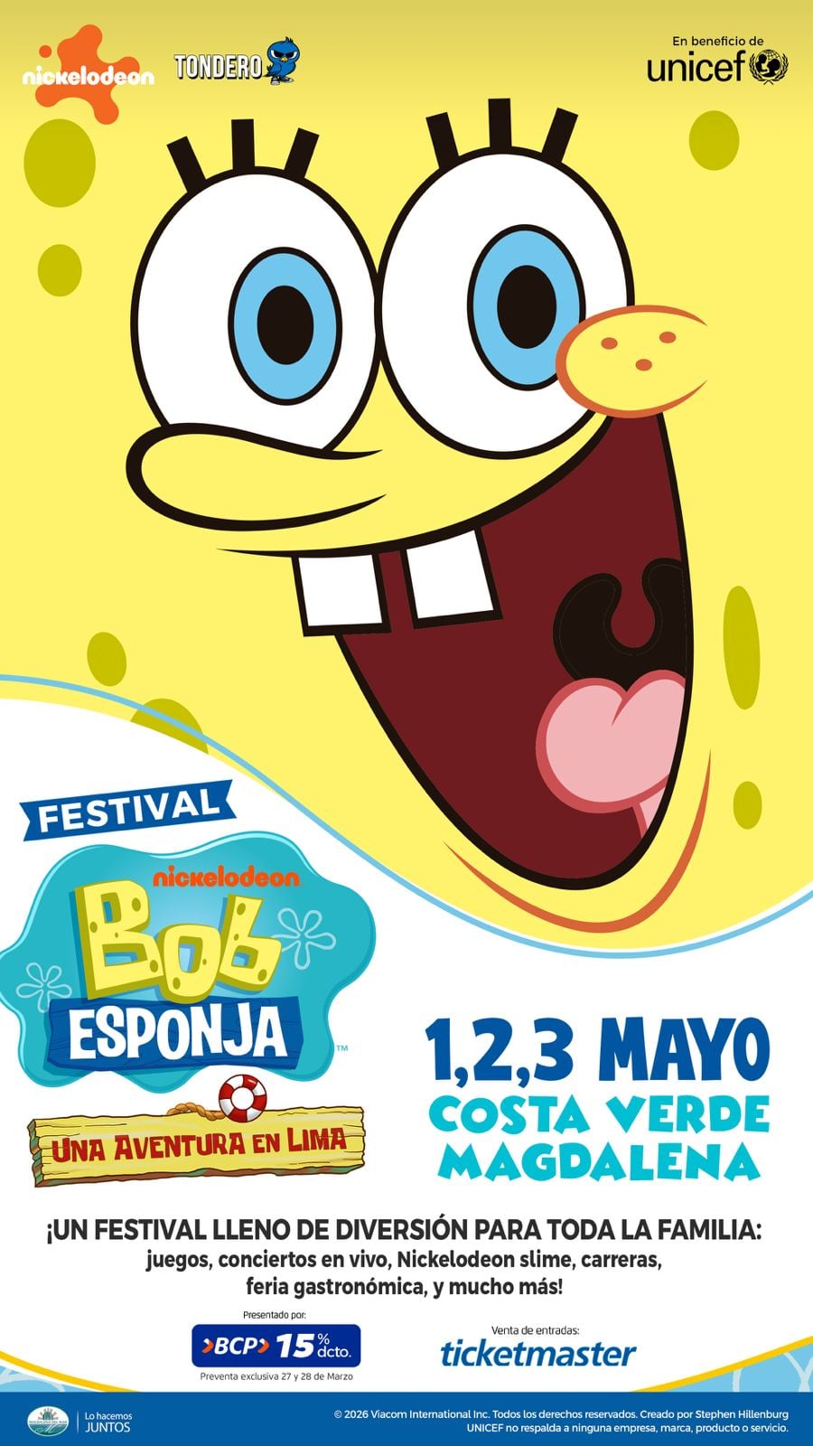 El Festival de Bob Esponja: Una Aventura en Lima llegará por primera vez a la capital peruana los días 1, 2 y 3 de mayo, con una propuesta familiar que reunirá juegos, espectáculos y actividades temáticas en la Costa Verde de Magdalena.