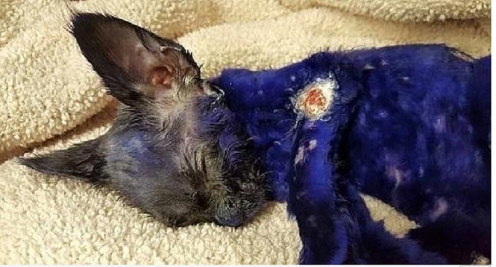 El gatito de tres meses llegó al centro completamente teñido de azul y con profundas heridas en todo su cuerpo e incluso tuvo que ser intervenido quirúrgicamente.