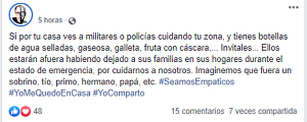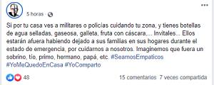 Es así que usuarios de las redes sociales han pedido que si ves a alguno en el trayecto en el que vas a abastecerte de alimentos y bebidas, les brindes algunos de tus productos a los efectivos de los entes estatales que cumplen una labor significativa en estos días.