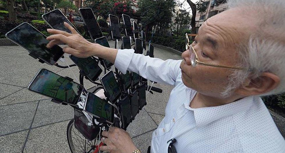 Un singular anciano de 70 años recorre a diario decenas de kilómetros abordo de su bicicleta, equipado con 24 teléfonos móviles en búsqueda de no dejar de practicar ni un solo instante su afición favorita de cazar Pokémones.
