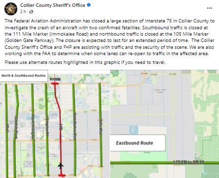 “La Administración Federal de Aviación cerró una gran sección de la Interestatal 75 en el condado de Collier para investigar el accidente de una aeronave con dos muertes confirmadas”, se lee en la publicación.