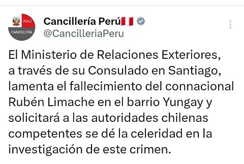 Por su parte, el Ministerio de Relaciones Exteriores, a través de su Consulado en Santiago, lamentó el fallecimiento de Rubén Limache y anunció que solicitará a las autoridades chilenas competentes se dé la celeridad en la investigación del asesinato.