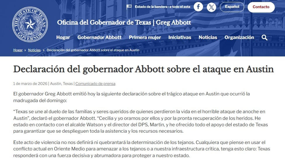 El gobernador republicano de Texas, Greg Abbott, emitió un comunicado en el que señaló que “Texas está de luto” y confirmó que su despacho mantiene coordinación con la alcaldía de Austin y el Departamento de Seguridad Pública para garantizar el despliegue de todos los recursos necesarios. En un mensaje de advertencia, Abbott señaló que las fuerzas del orden responderán de manera firme.