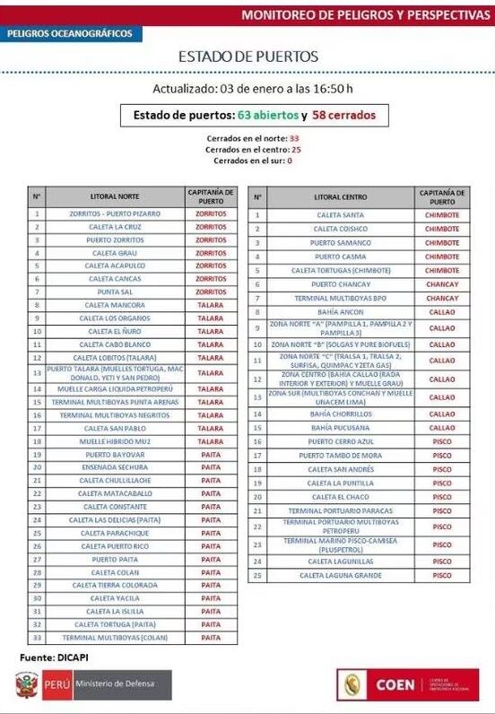 El Centro de Operaciones de Emergencia Nacional (COEN) comunicó que, de acuerdo con la información proporcionada por la Dirección General de Capitanías, el número de puertos cerrados en el litoral aumentó a 58 el miércoles 3 de enero, debido a la presencia de oleajes con intensidad que va desde ligera a moderada.