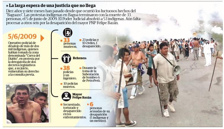 Más de 10 años han pasado desde los luctuosos hechos por el denominado “Baguazo”, ocurrido el 5 de junio del 2009, durante el segundo gobierno de Alan García. Sin embargo, el sistema de justicia aún no puede determinar la responsabilidad de la muerte de 23 policías, 10 nativos y un desaparecido,el mayor Felipe Bazán Soles.