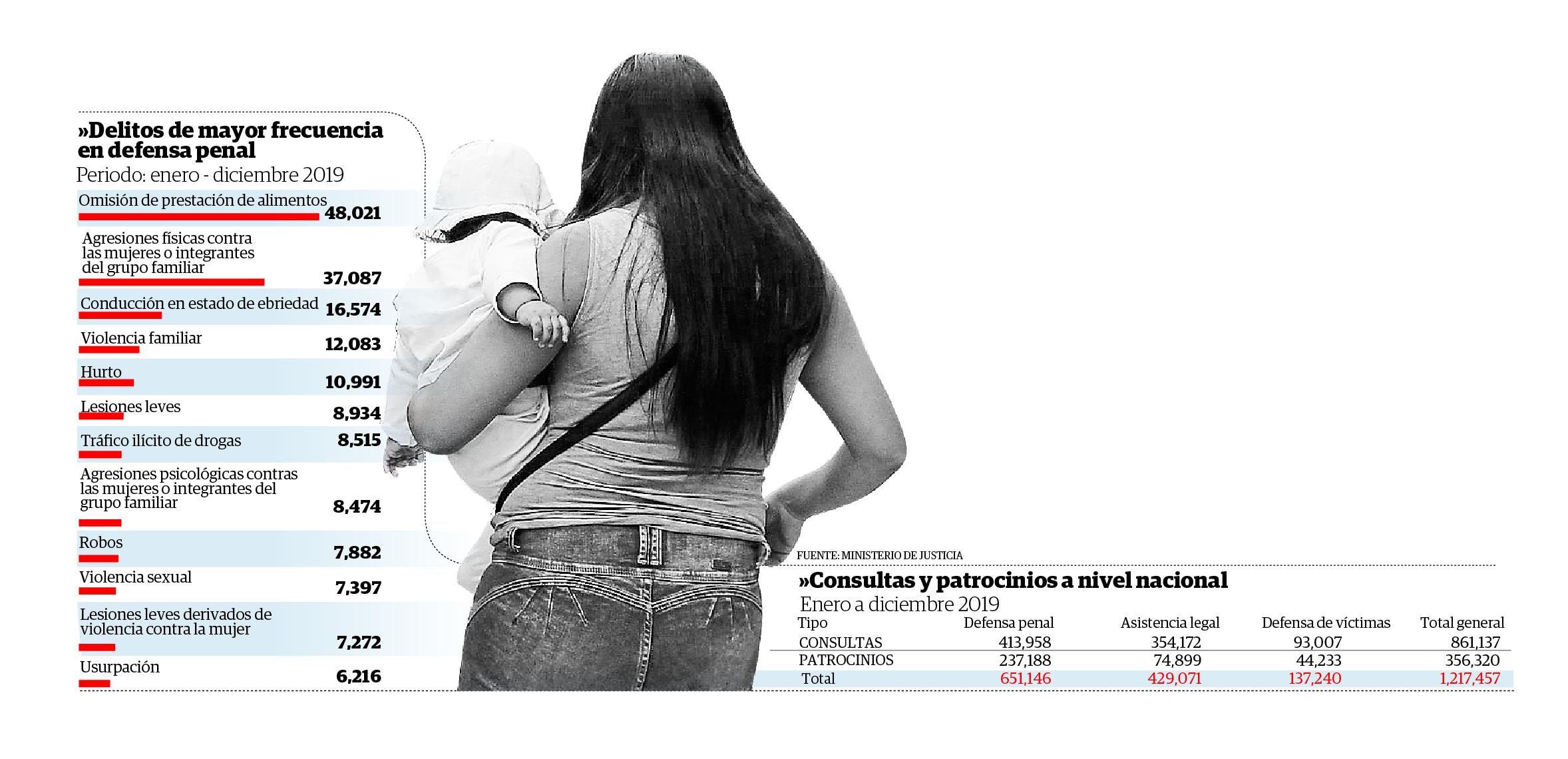 De esa cifra, 861 mil 137 han correspondido a consultas y 356 mil 320 casos han sido patrocinios legales. Los delitos de mayor frecuencia atendidos, en defensa penal, fueron la omisión de prestación de alimentos y agresiones físicas contra las mujeres o integrantes del grupo familiar con 48 mil 021 casos y 37 mil 087 casos, respectivamente, así lo informó a Correo el viceministro de Derechos Humanos, Daniel Sánchez. En tanto, en enero de 2020 se han atendido cuatro mil 299 casos por el primer delito y 3,486 por el segundo delito mencionado.
