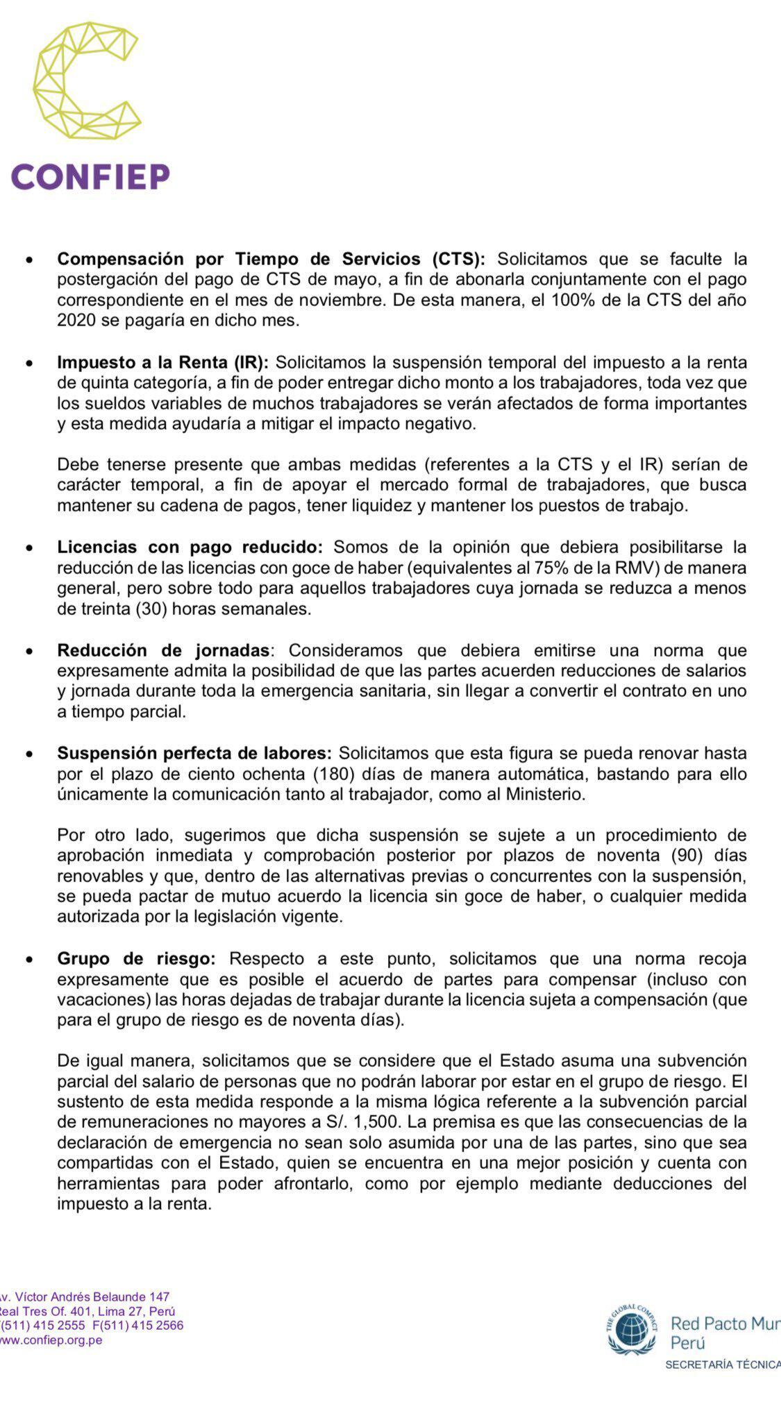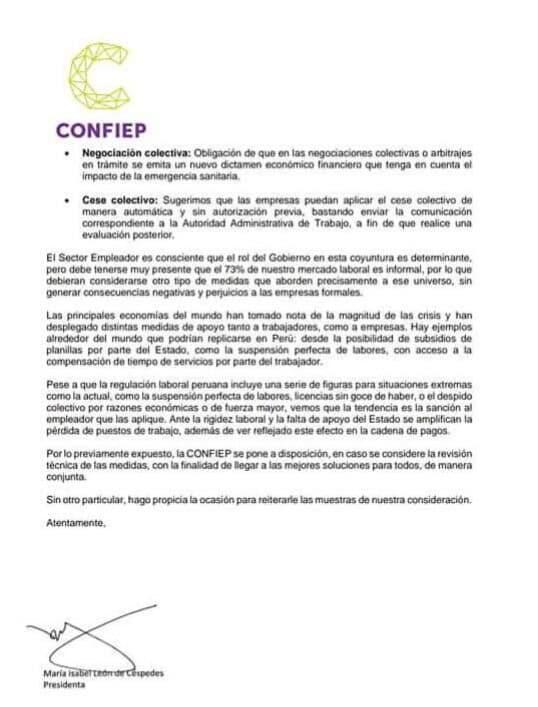 Como última medida, el grupo empresarial pide que el Ministerio de Trabajo autorice a que las empresas puedan ejecutar el cese colectivo “de manera automática y sin autorización”, solo teniendo como requisito la comunicación del hecho a la Autoridad Administrativa de Trabajo.