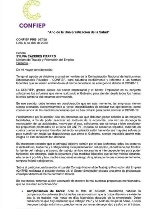 Ante la grave situación sanitaria en la que se encuentra el Perú por el incremento de número de casos de coronavirus, la Confederación Nacional de Instituciones Empresariales Privadas (Confiep) recomendó al Ministerio de Trabajo adoptar una serie de medidas para frenar la afectación a las empresas formales del país.