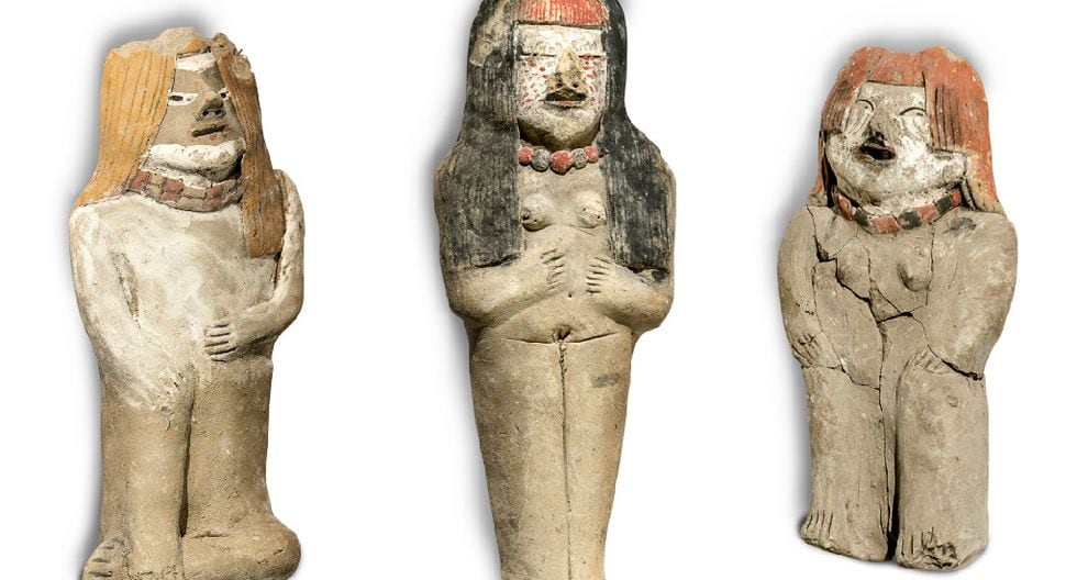 Las esculturas polícromas de barro no cocido, halladas entre la arena, ceniza y material orgánico evidencian un profundo significado simbólico;por la posición de las esculturas se trataría de una pareja de autoridades políticas vinculadas a la sacerdotisa.
