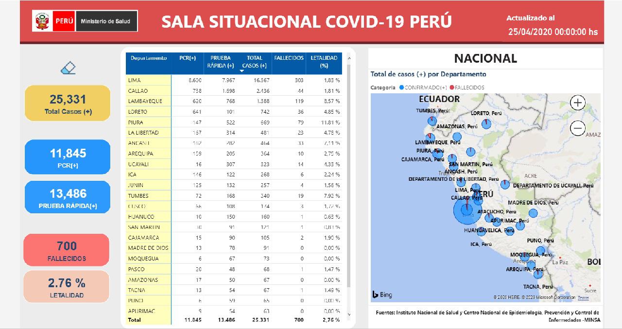 El Ministerio de Salud, informó que el número de casos positivos de coronavirus en el Perú se elevó de 21, 648 -cifra registrada en la víspera- a 25,331, en esta tercera etapa de aislamiento social obligatorio para combatir al COVID-19 en el país.
