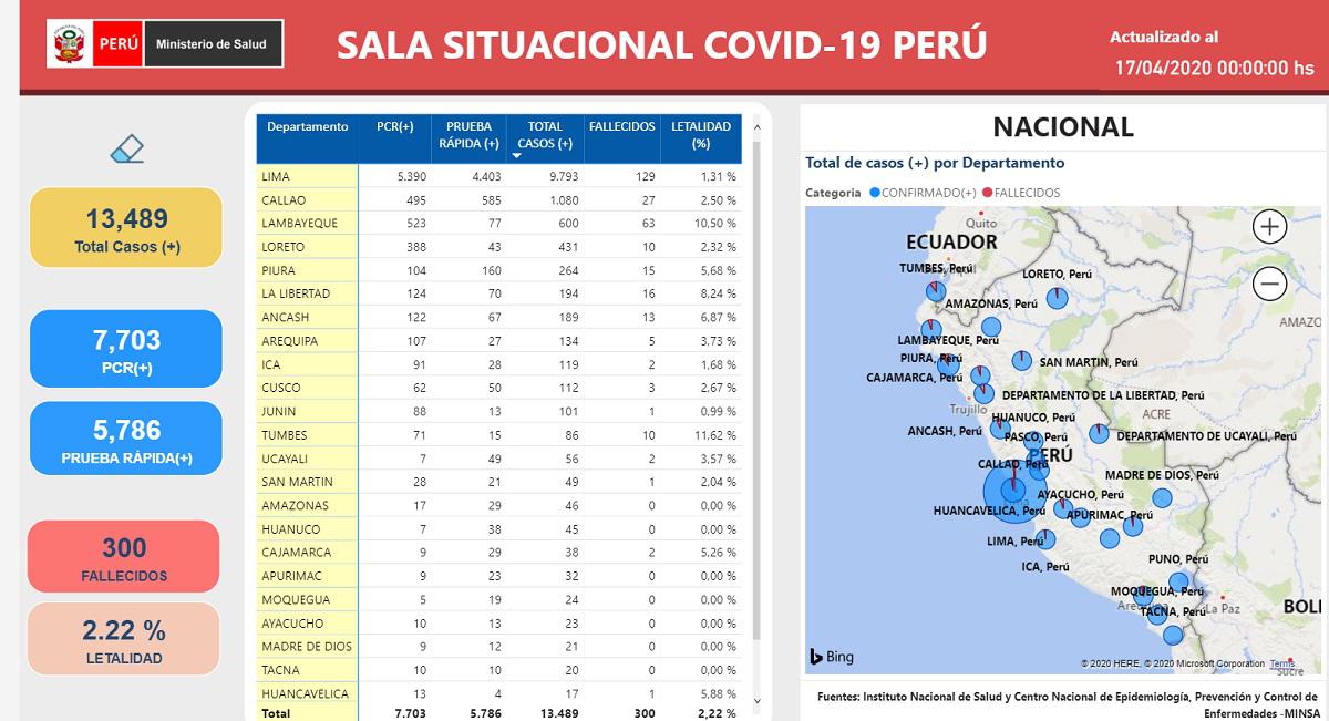 El Ministerio de Salud, informó que el número de casos positivos de coronavirus en el Perú se elevó de 12,491 -cifra registrada en la víspera- a 13,489, en esta tercera etapa de aislamiento social obligatorio para combatir al COVID-19 en el país.