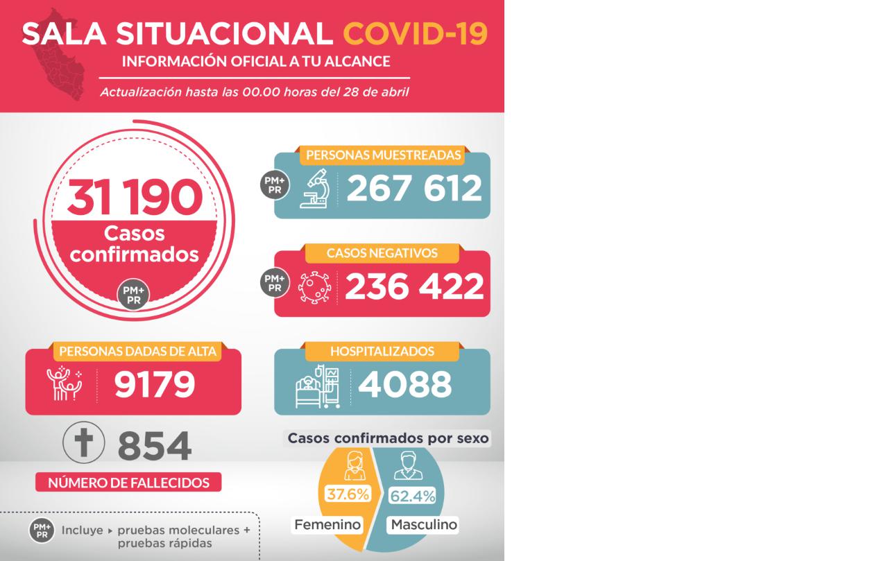 Asimismo, el ministro de Salud Víctor Zamora informó desde su cuenta de Twitter que el número de casos positivos de coronavirus en el Perú se elevó a 31 190.