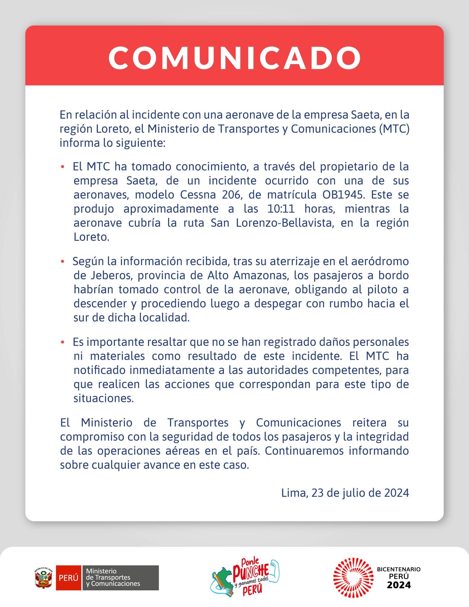 “El MTC ha tomado conocimiento, a través del propietario de la empresa Saeta, de un incidente ocurrido con una de sus aeronaves, modelo Cessna 206, de matrícula OB1945. Este se produjo aproximadamente a las 10:11 a.m., mientras la aeronave cubría la ruta San Lorenzo-Bellavista, en la región Loreto”, informaron.