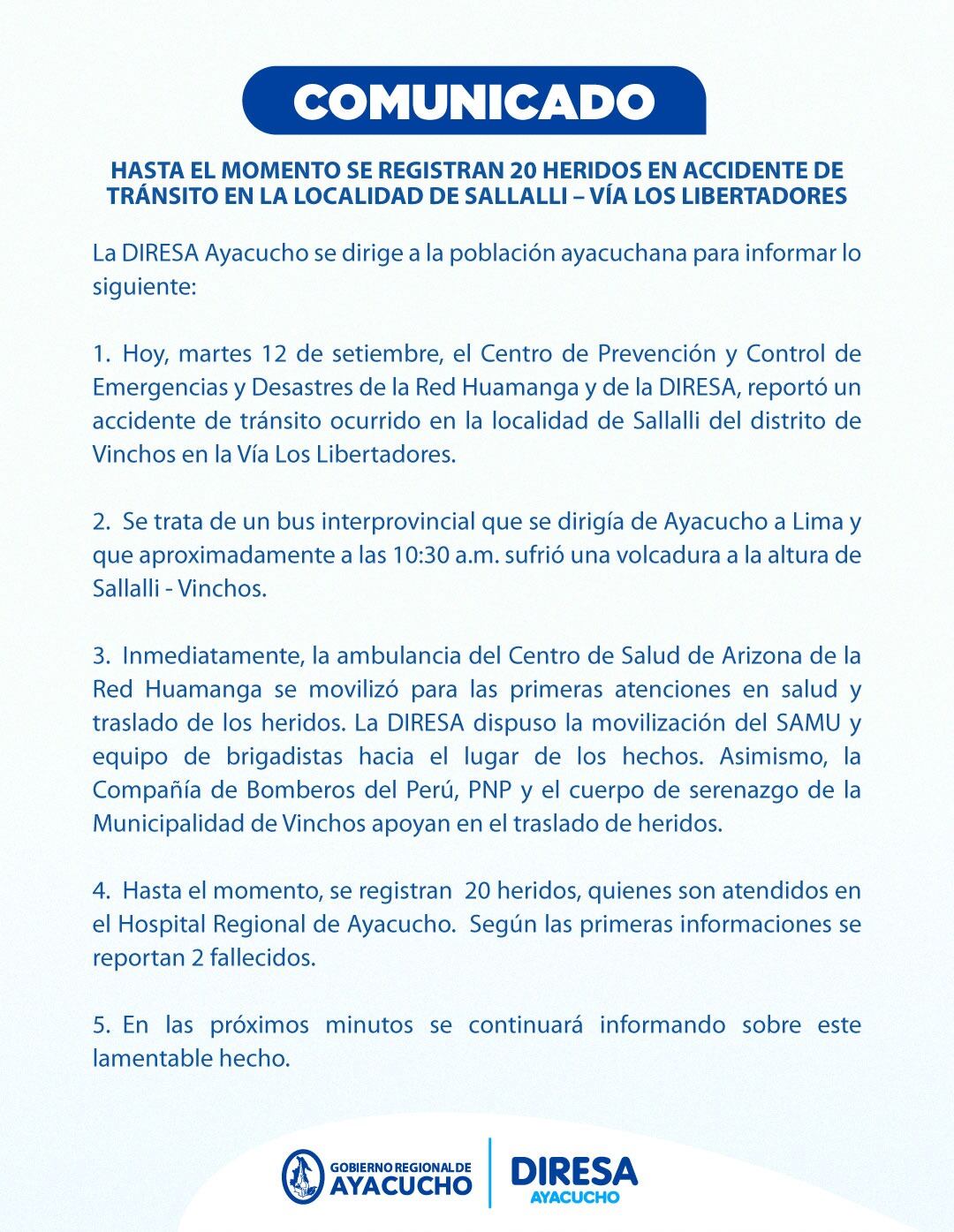 Un accidente tuvo lugar cuando un bus interprovincial de la empresa Pardo se desvió y colisionó contra un cerro en el kilómetro 302 de la vía Los Libertadores, ubicado en el distrito de Vinchos, provincia de Huamanga. Este vehículo realizaba el trayecto Ayacucho-Lima.
