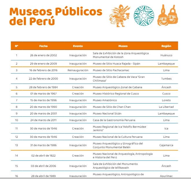 El Ministerio de Cultura, a través de la Dirección General de Museos (DGM), dispuso el ingreso libre, a todos los ciudadanos peruanos y visitantes extranjeros a los 56 museos administrados por el Estado a nivel nacional, en los días de sus aniversarios de creación o inauguración institucional.