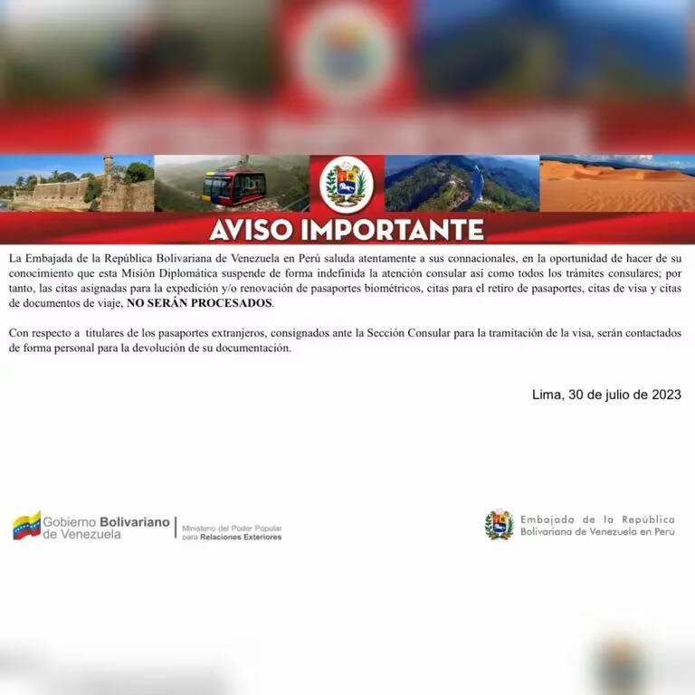 La Embajada de Venezuela en Perú anunció mediante sus redes sociales, que suspenden de forma indefinida su atención de todos los trámites consulares.