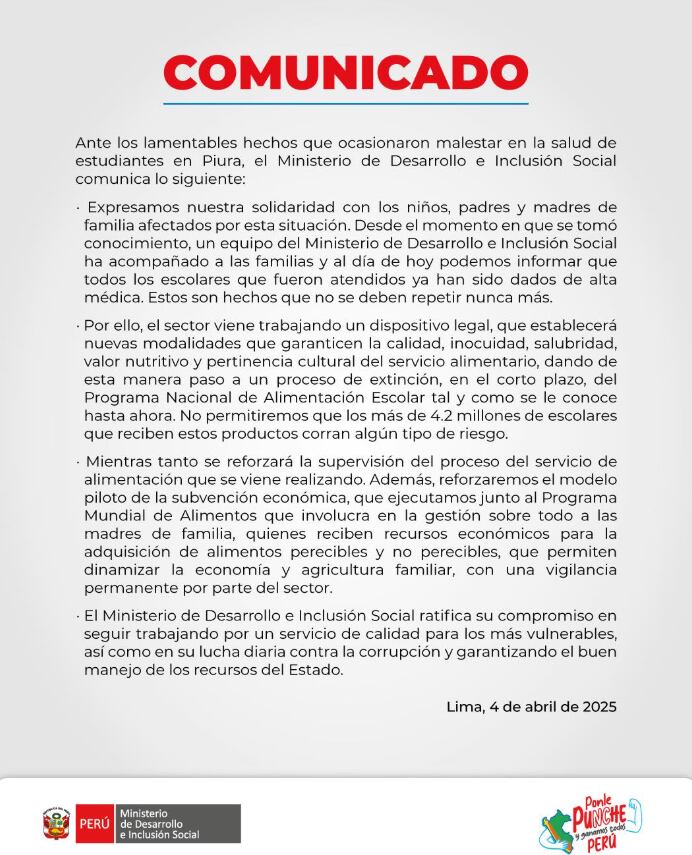 El Ministerio de Desarrollo e Inclusión Social (MIDIS) confirmó que los escolares afectados en Piura ya fueron dados de alta médica y anunció nuevas medidas para mejorar la calidad y seguridad del servicio de alimentación escolar.