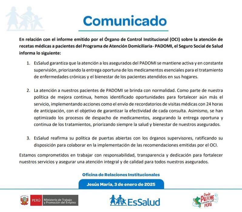 A través de un comunicado, EsSalud informó que la atención a los asegurados del Programa de Atención Domiciliaria (PADOMI) se mantiene activa y supervisada, priorizando la entrega oportuna de medicamentos para enfermedades crónicas. La institución destacó la implementación de recordatorios de visitas médicas y mejoras en el despacho de medicinas para garantizar la calidad del servicio. Asimismo, reafirmaron su disposición para colaborar con las recomendaciones del Órgano de Control Institucional (OCI).
