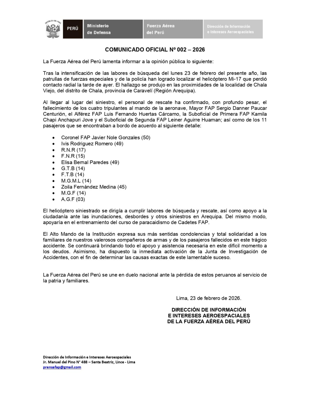 La Fuerza Aérea del Perú (FAP) informó este 23 de febrero de 2026 el hallazgo del helicóptero Mi-17 que había perdido contacto radial durante labores de búsqueda y rescate en la región Arequipa.