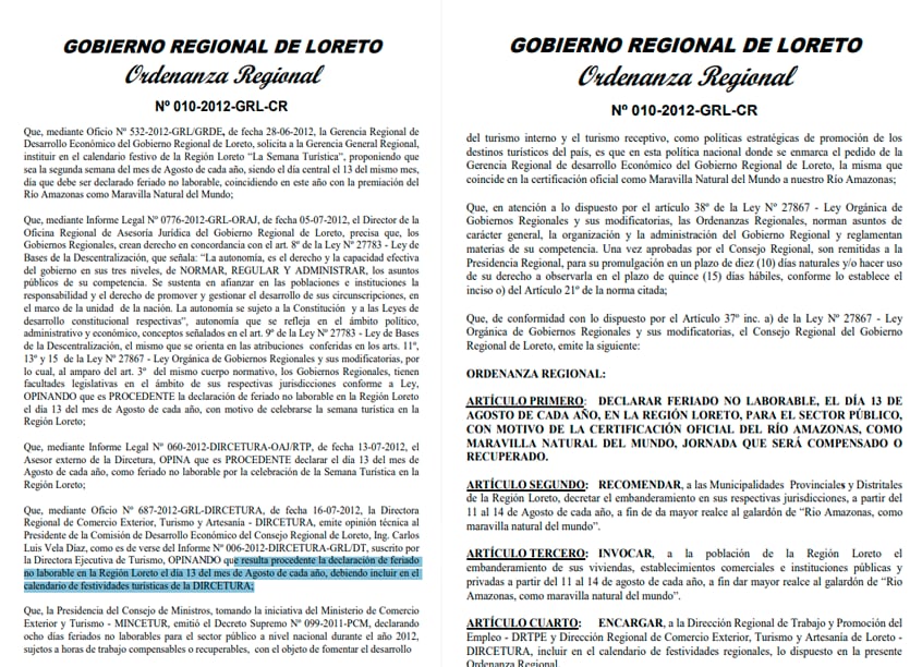 Mediante la Ordenanza Regional N° 010-2012-GRL-CR, publicada en el diario oficial El Peruano, se declara no laborable cada 13 de agosto en Loreto para celebrar el reconocimiento oficial del río Amazonas como una de las Siete Maravillas Naturales del Mundo, distinción otorgada por la Fundación New 7 Wonders en 2012.