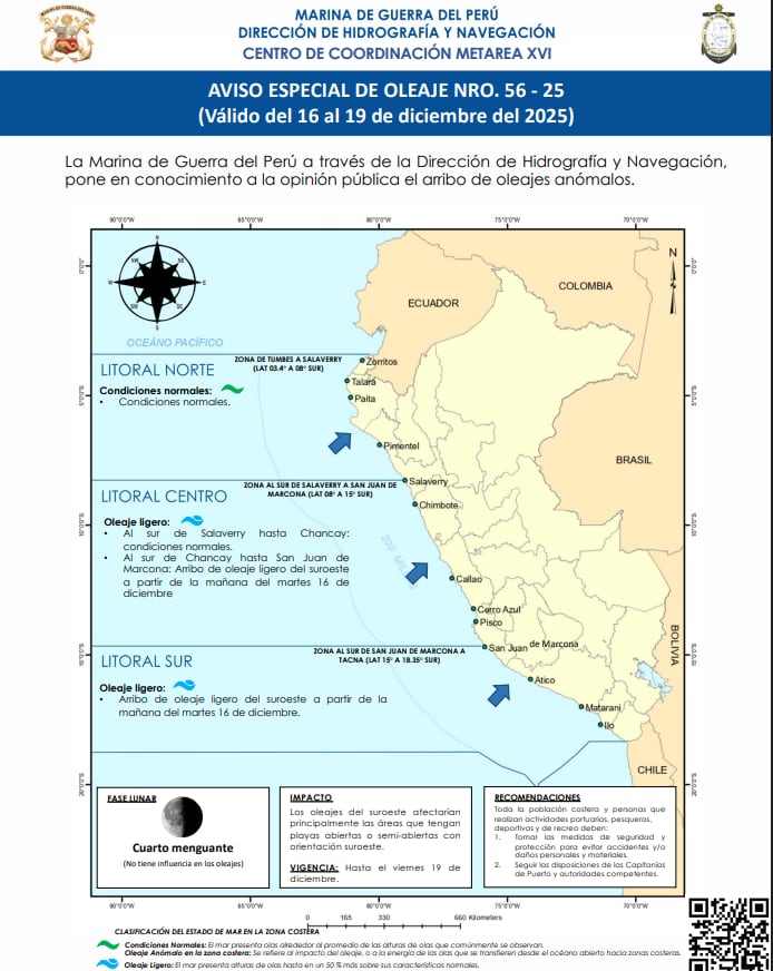 La situación cambiaría para el litoral centro, definido como la zona al sur de Salaverry hasta San Juan de Marcona. Desde el sur de Salaverry hasta Chancay, las condiciones seguirán siendo normales. Sin embargo, desde el sur de Chancay hasta San Juan de Marcona se registrará oleaje ligero a partir de la mañana del martes 16 de diciembre.