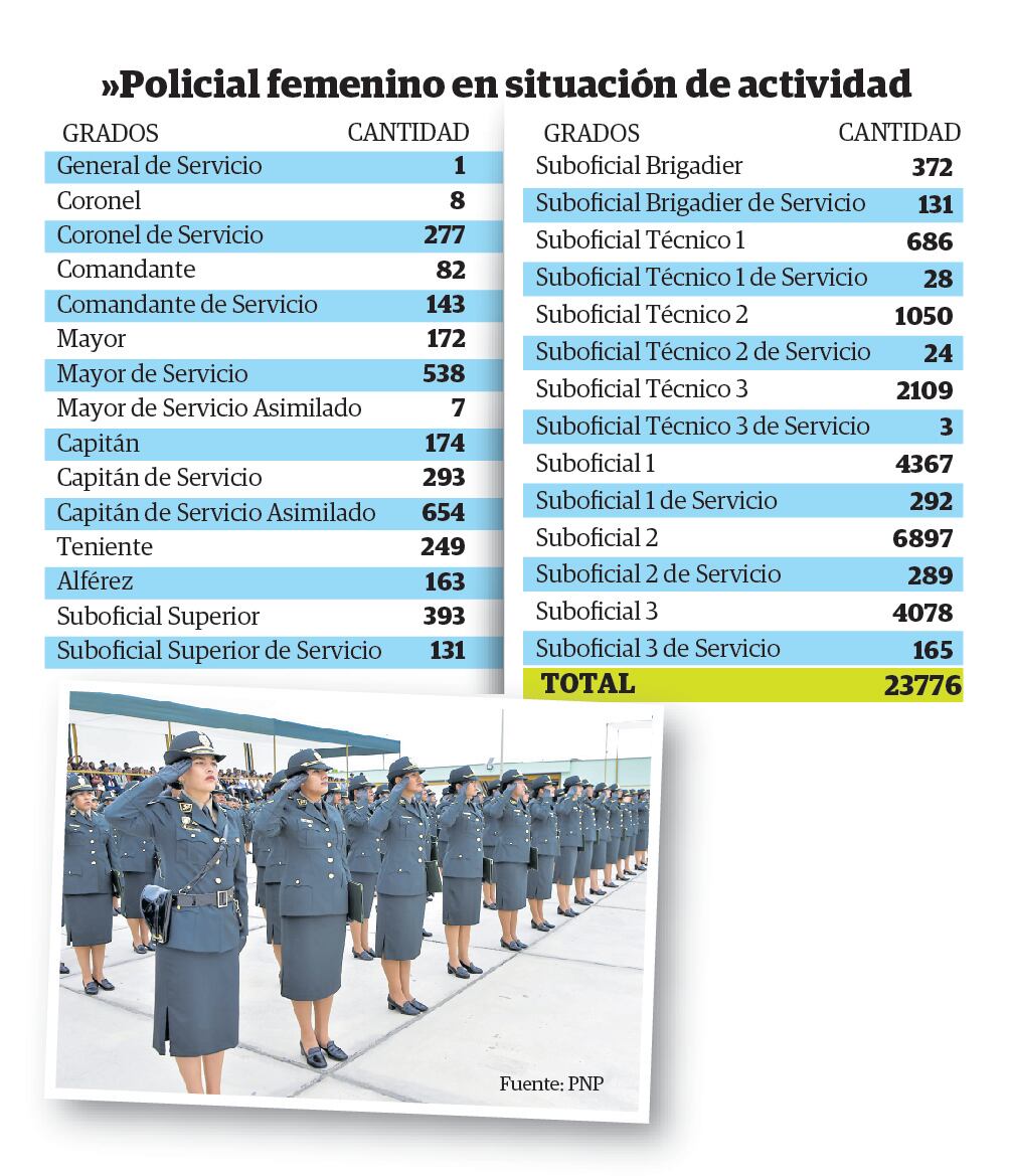 Así se puede comprobar con las cifras que la institución compartió recientemente con Correo, en el marco del Mes de la Mujer, que hoy despedimos a nivel nacional. La data revela que el cuerpo policial del país está integrado por 23,776 agentes femeninas, con diversos grados y cargos de enorme responsabilidad. (Ver infografía).