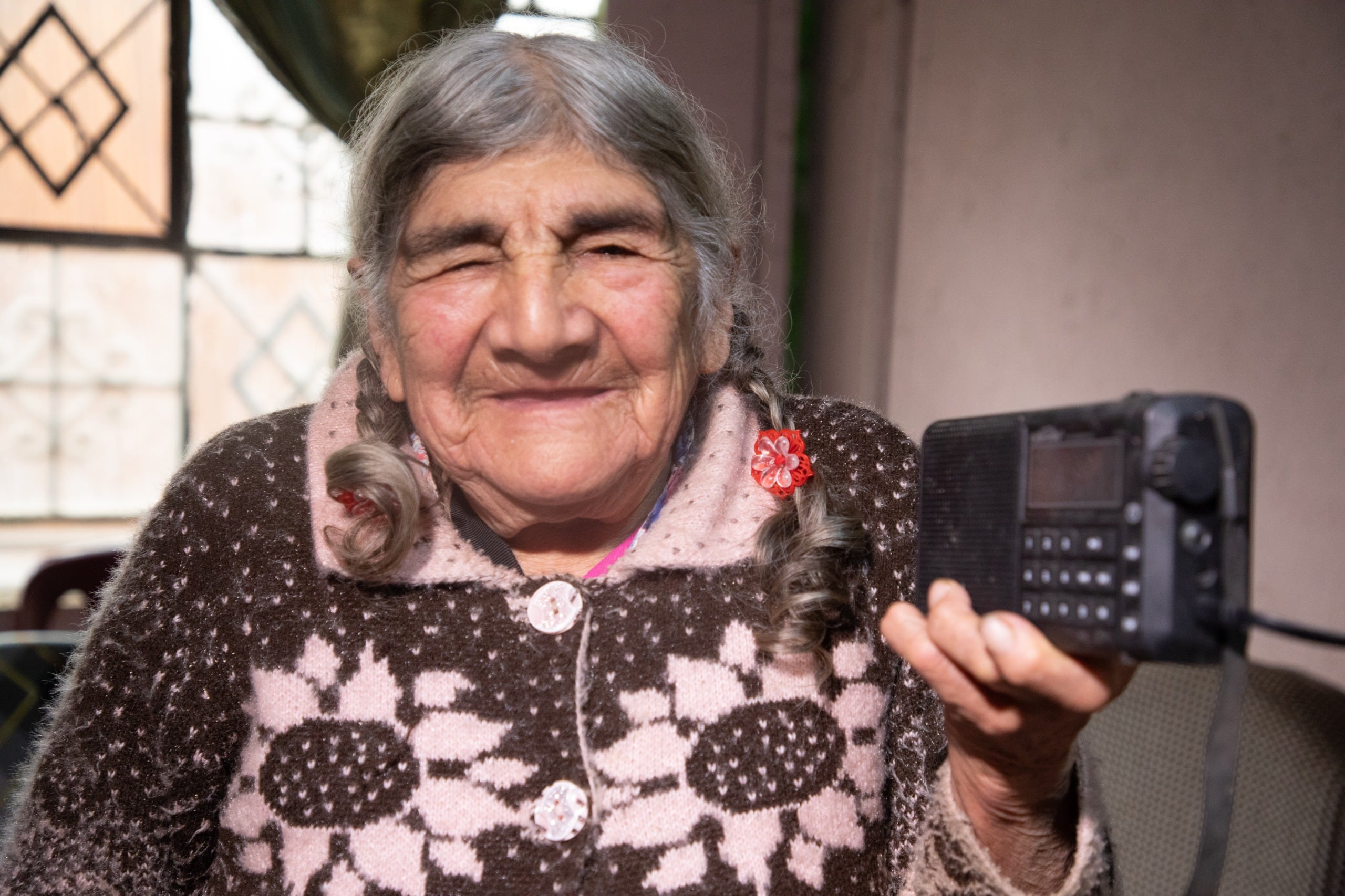 En el distrito de San Juan de Miraflores, doña Bertha Trillo Soria, de 102 años, destaca por su buen humor y energía. Cada mañana enciende su radio a pilas para escuchar huainos mientras organiza sus actividades diarias y acompaña a su hija Adela al mercado local.