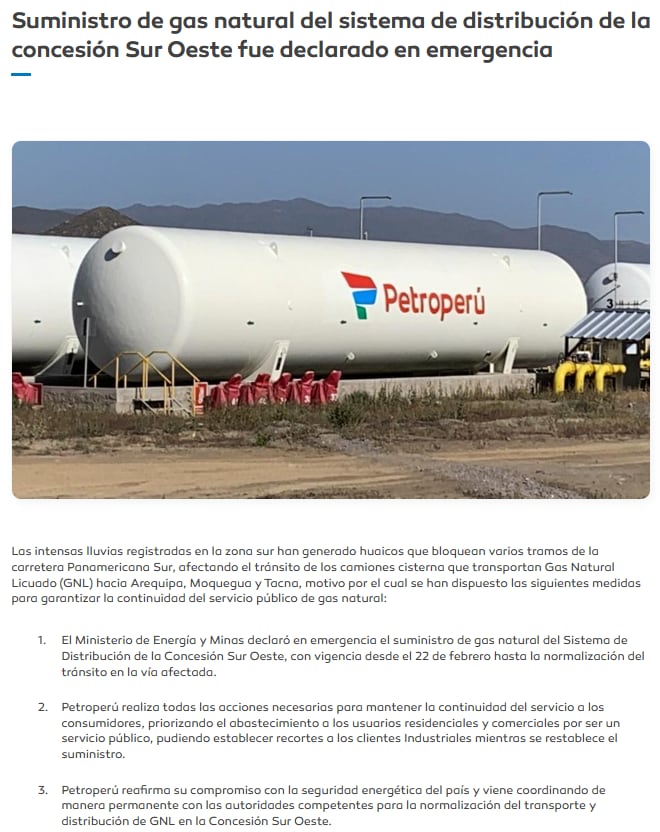 Ante dicha situación, el Ministerio de Energía y Minas (Minem), mediante la Dirección General de Hidrocarburos (DGH), declaró en emergencia el suministro de gas natural del Sistema de Distribución de la Concesión Sur Oeste, medida vigente desde el 22 de febrero hasta la normalización del tránsito.