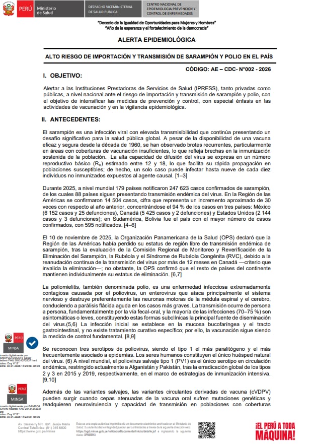 El Ministerio de Salud (Minsa), a través del Centro Nacional de Epidemiología, Prevención y Control de Enfermedades (CDC Perú), declaró una alerta epidemiológica nacional debido al alto riesgo de ingreso y propagación de sarampión y poliomielitis en territorio peruano.