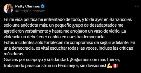 “En mi vida política he enfrentado de todo, y lo de ayer en Barranco es solo una anécdota más: un pequeño grupo de desadaptados me agredieron verbalmente y hasta me arrojaron un vaso de vidrio”, indicó Patricia Chirinos en su cuenta de “X”, antes Twitter.