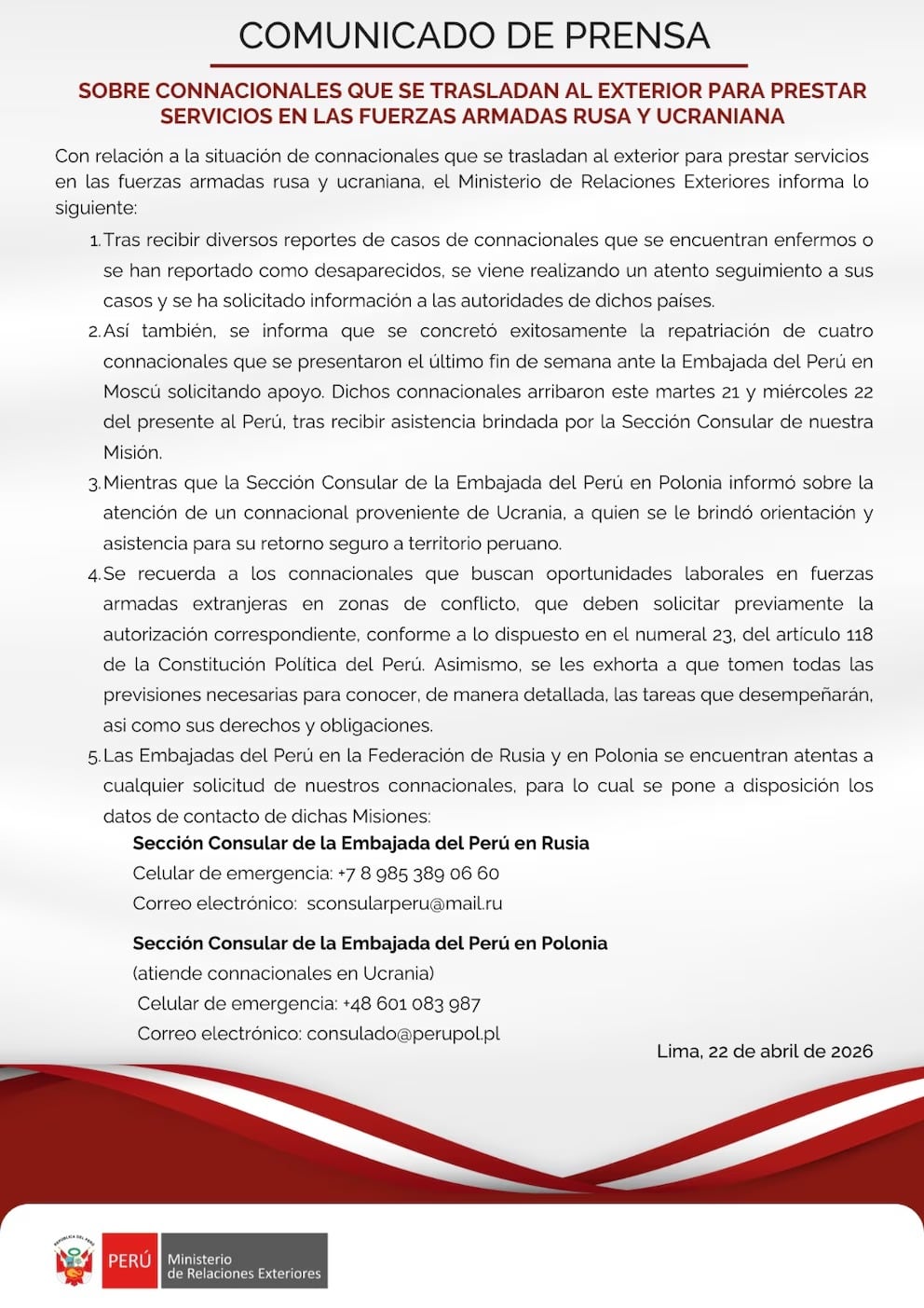 Ante las denuncias de los familiares, la Cancillería peruana informó el pasado 22 de abril que no dispone de los recursos necesarios para llevar adelante una repatriación masiva. La institución indicó que los salvoconductos consulares están disponibles únicamente para quienes logren llegar por sus propios medios a la embajada en Moscú.