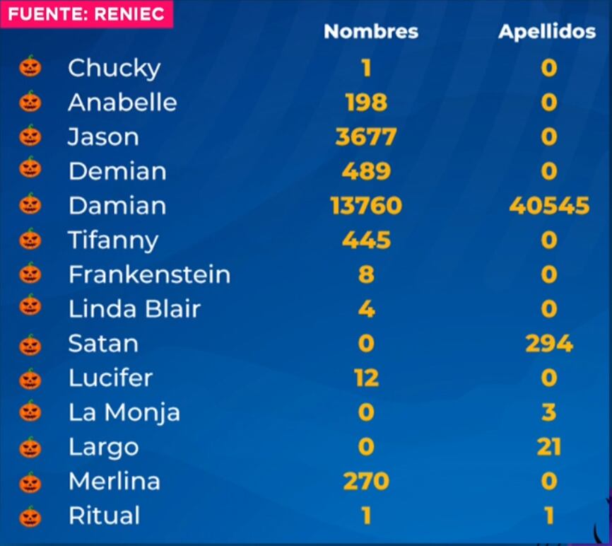 En el marco de la celebraciones de Halloween, la institución reveló también que nuestro país es habitado por 8 Frankenstein, 12 lucifer, 198 Anabelle, 270 Merlina y 489 Demian. Además, se pudo conocer que 294 peruanos llevan a Satan (sin tilde) como apellido.